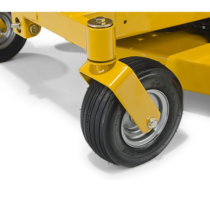 Hustler’s heavy duty fabricated frames are the best in the category. Hustler took everything they know about building heavy duty commercial machines and used that knowledge to make a tough chassis. I see no problems with cracking of flexing over time. The front caster forks are built-up 1/4 in steel with a tall 11in x 4in front caster tire.